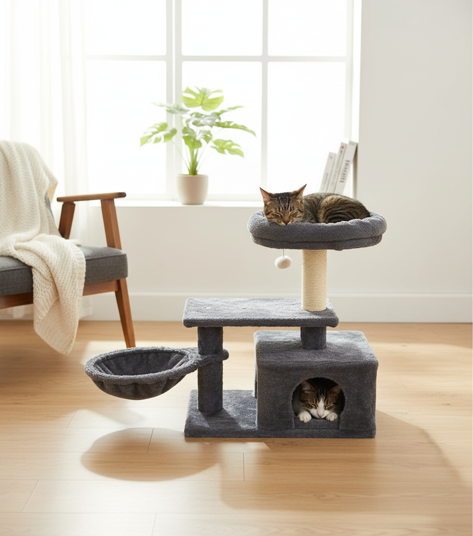 מגדל פעילות יוקרתי לחתולים עם עמודי גירוד ובתי מנוחה